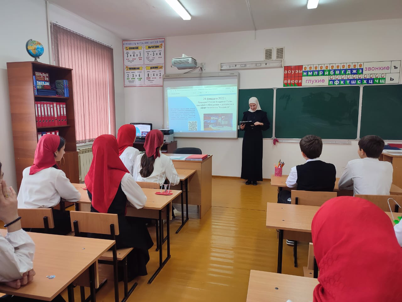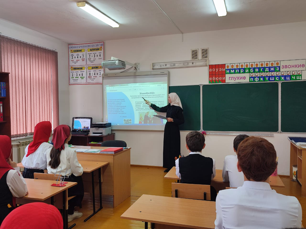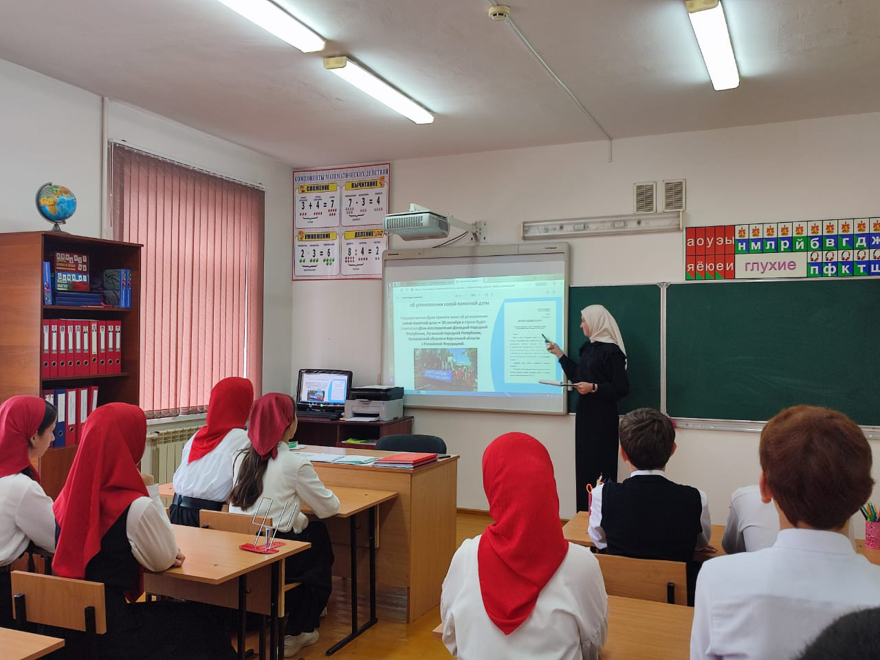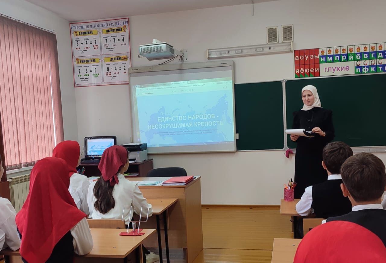 В МБОУ "ООШ имени генерала Ахмада Рамзи с.Алхан" прошёл информационный час «Единство народов - несокрушимая крепость ». Ребята с интересом слушали рассказ об истории самого молодого праздника России, рассуждали о том, что нам всем необходимо поддерживать и помогать жителям новых российских регионов.